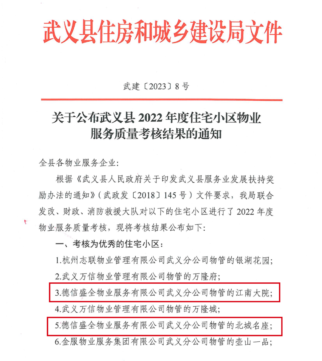 2月8日,浙江金华武义公布2022年度住宅小区物业服务质量考核结果。德信服务在管的金华武义江南大院、北城名座两个住宅小区,在考核中成功被评为“优秀住宅小区”。值得一提的是,江南大院小区,已经连续两年荣获“优秀小区”。同时,还获评“浙江省高标准生活垃圾分类示范小区”以及“金华市园林式居住区”等多项荣誉。